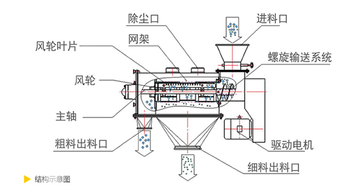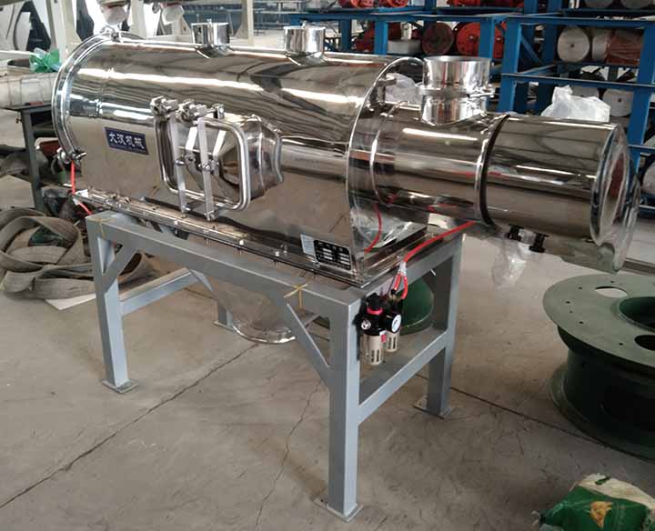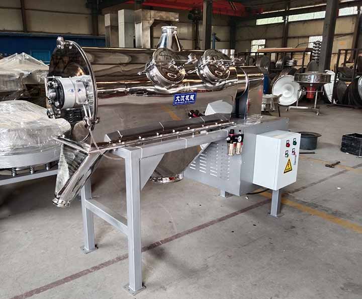 離心式篩分機從外觀上看上部為水平放置的圓柱形、下部為圓錐形的密閉容器,篩機下面有支腿以支撐整個篩機。電機通常位于設備頂部或底部,通過皮帶或直接驅動主軸。進料口通常在筒的一端或頂部,物料通過管道或漏斗送入。出料口有兩處,一處是細顆粒出口,一處是大顆粒出口,一般在筒的另一端或筒側面。